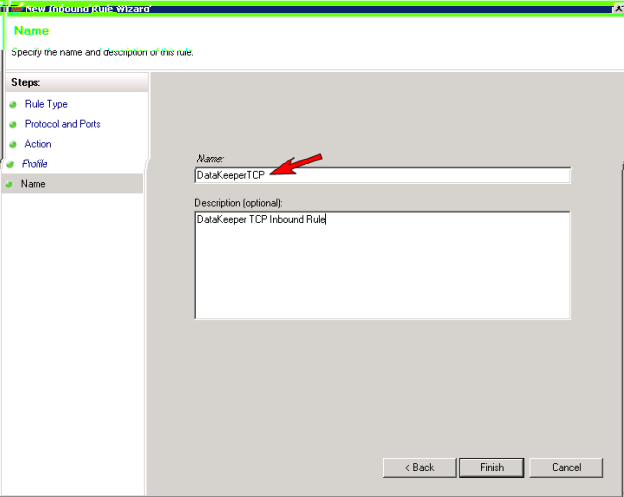 Enter a Name and Description for the new Inbound Rule and select Finish.