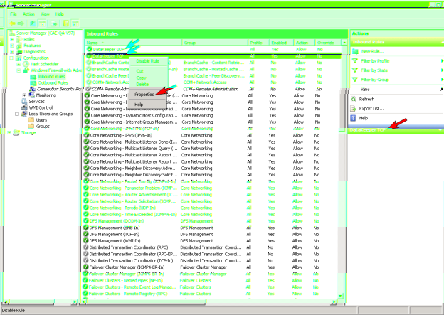 Your new DataKeeper rules will appear in the Inbound Rules list and the Action panel column. You can select the DataKeeper rule in the center panel and click the right mouse button to view the rule Properties.