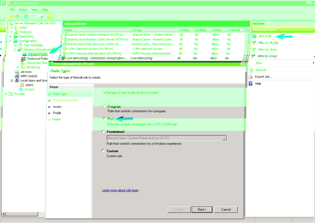Open Microsoft's Windows Server Manager and select Inbound Rules to create a rule for the TCP protocol as well as the UDP protocol.