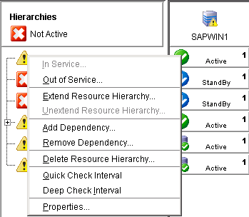 The resource context menu appears when you right-click on a global (cluster-wide) resource, as shown above, or a server-specific resource instance, as shown below, in the status table. The default resource context menu is described here, but this menu might be customized for specific resource types in which case the menu will be described in the appropriate resource kit documentation.