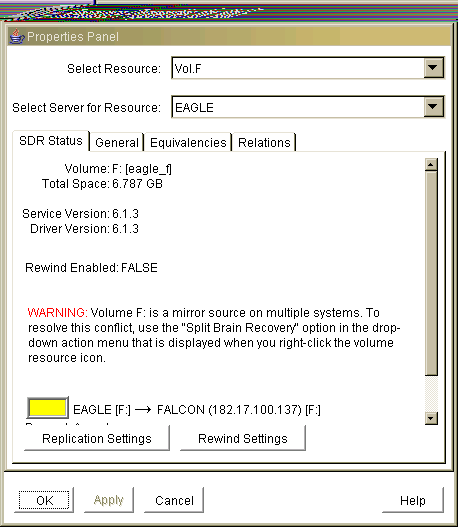 The Properties Panel for the selected volume displays additional information about the split-brain condition and instructions for resolving this problem.