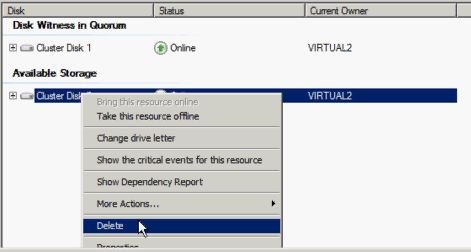 b. Remove the physical disk from cluster resource group (moves to Available Storage).