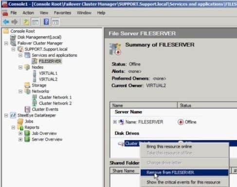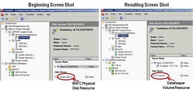 - Replace the existing WSFC physical disk resource with a DataKeeper volume resource that supports data replication.
