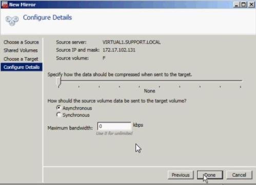 f. Configure Details. Choose compression settings, if applicable, and choose mirror type, asynchronous or synchronous. Select Done.