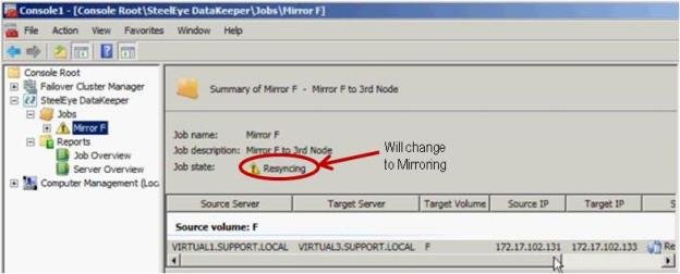 The mirror will then begin resyncing to the third node. After resyncing is complete, the Job State will change to Mirroring.
