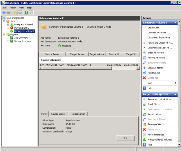 - The right column is the Actions view. This pane appears when activated through the View menu. The options available from this pane are the same options available from the Action menu. This column is divided into two sections. The Actions in the top section apply to the job and every mirror within the job. The Actions in the bottom section apply only to the selected mirror.