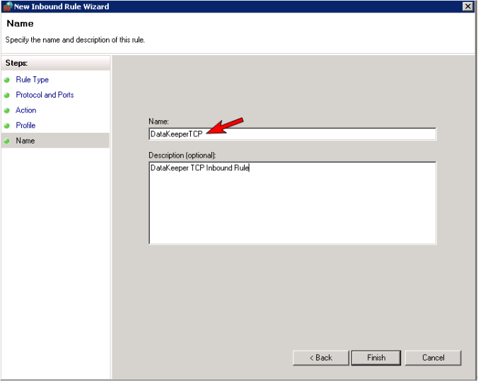 - Enter a Name and Description for the new Inbound Rule and select Finish.