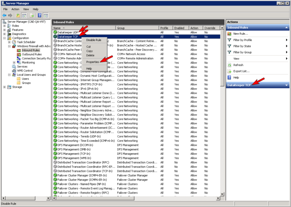- Your new DataKeeper rules will appear in the Inbound Rules list and the Action panel column. You can select the DataKeeper rule in the center panel and click the right mouse button to view the rule Properties.