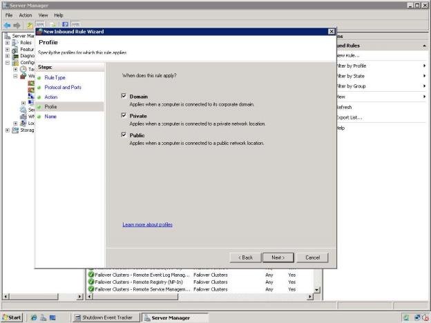 - For the profile, select Domain, Private and Public for the conditions when this rule applies. Select Next.