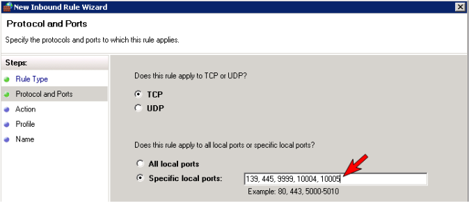 - Select TCP for the type of protocol impacted by this rule. Select the Specific local ports button and enter the following ports: 139, 445, 9999, 10004 (for the E drive) and 10005 (for the F drive). Select Next.
