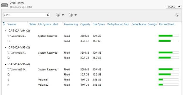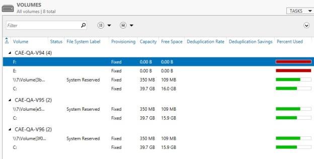 In the following example, the DataKeeper Volumes E and F are split. One is Cluster Owner\Source on CAE-QA-V95 and the other is Cluster Owner\Source on CAE-QA-V96; however, the Server Manager “Volumes” display shows the volumes (E & F) on CAE-QA-V94 with red “percent used” progress bars and does not show any volumes on CAE-QA-V95 or CAE-QA-V96.