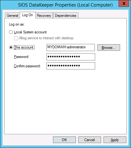 Note: For Workgroups, use the Server Account option and use the server name \ administrator on each system as the Service Account for DataKeeper. You should also log on to all servers using this same Log On ID and Password (see related Known Issue).