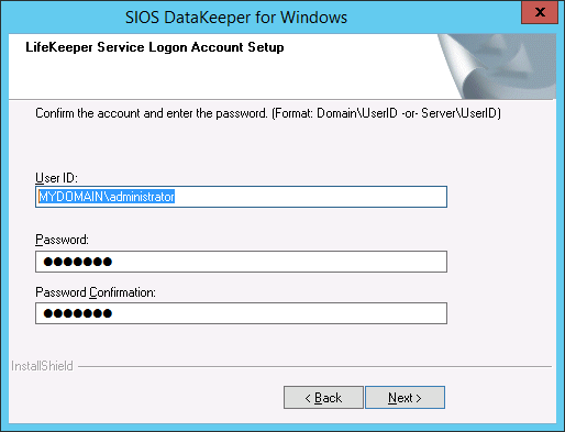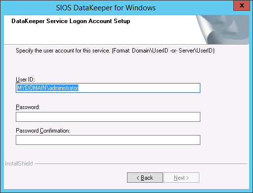 If the DataKeeper Service has previously been configured with a Service Log On ID and Password, the setup program will omit the Service ID and Password selection dialogs. However, at any time, an administrator can modify the DataKeeper Service Log On ID and Password using the Windows Service Applet. Be sure to restart the DataKeeper Service after changing the Log On ID and/or Password.