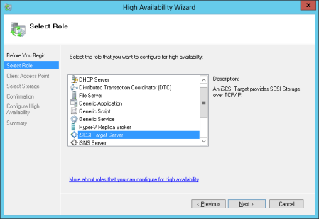 1. From the Windows Failover Cluster Manager UI (cluadmin.msc), select Configure Role and navigate to the screen to select the iSCSI target role.