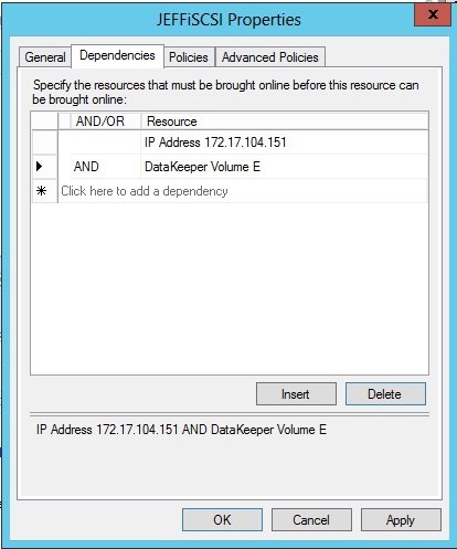c. Select the Dependencies tab and add the appropriate DataKeeper volume(s) as dependencies.