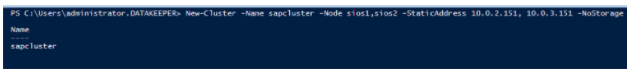 New-Cluster -Name sapcluster -Node sios1,sios2 -StaticAddress 10.0.2.151, 10.0.3.151 -NoStorage