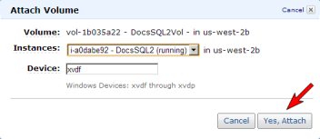 - ボリュームを接続する インスタンス を選択して 、 [Yes, Attach] を選択します。ステータスが [available] から [in-use] に変わります。