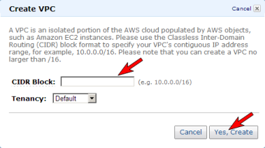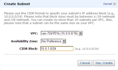 - 下記のように CIDR (Classless Inter-Domain Routing) を入力して仮想プライベートクラウドサブネットを定義してから、 [Yes, Create] をクリックします。