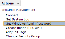 - [Actions] ドロップダウンメニューから、 [Connect] 、 [RDP Client tab] をクリックし、 [Get Password] を選択します。 保存した [Key Pair] を参照してください。 [Decrypt Password] をクリックしてください。パスワードが表示されます。安全な場所に保存してください。