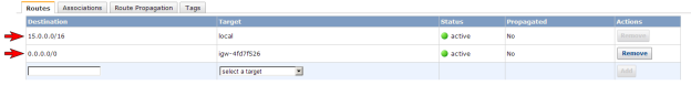 - 下側のペインの [Routes] タブの 1 行目はローカルルートです。これによって仮想プライベートクラウド内の通信が可能になります。 [Edit routes] をクリックし、 [Internet Gateway] を 0.0.0.0/0 に関連付けます。これは 2 行目に表示され、仮想プライベートクラウド (0.0.0.0/0) へのアクセスを提供します。このサブネットからの全トラフィックが [Internet Gateway] に転送されるため、このサブネットはパブリックと呼ばれます。