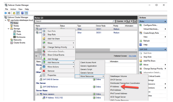 When configuring clusters for applications like SQL Server, the installer recognizes when the cluster is a multi-subnet cluster. However, the SAP installer does NOT recognize that fact, so we need to perform some of the configuration steps manually. One of those steps is to create the cluster IP address resources that reside in the subnet of the secondary node. The steps are as follows: