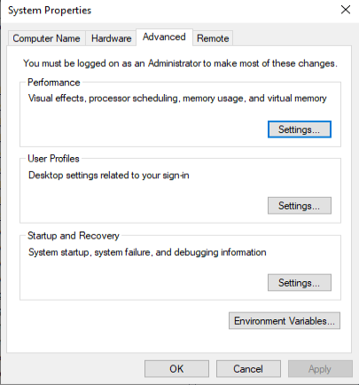 From the System Properties dialog, choose the Advanced tab and click the Settings button in the Performance section.
