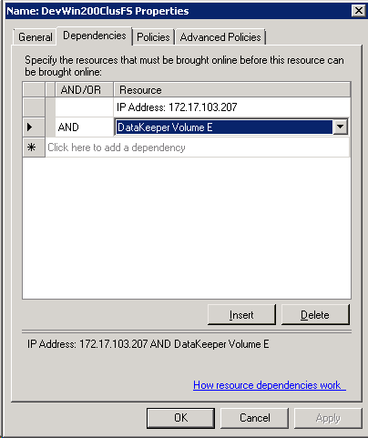 b. DataKeeper ボリューム リソースを ファイルサーバ リソースの依存関係として追加し、[OK] をクリックします。