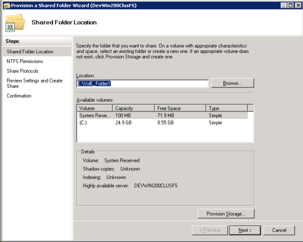 b. [共有フォルダの場所] 画面 (下図を参照) で、参照ボタンを使用して、DataKeeper ボリューム上で共有するフォルダの場所を指定します。 [次へ] をクリックします。