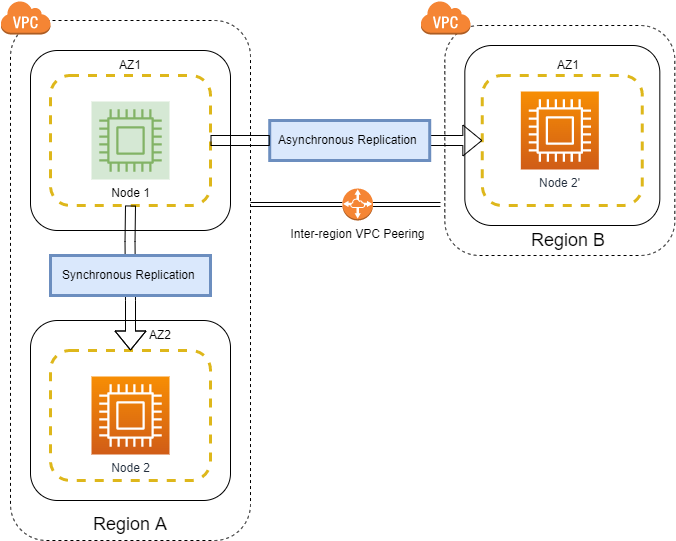 The diagram above generally shows an active/source node (in green) synchronously replicating to a passive node, both existing in the same region (Region A). Synchronous replication can also be used for cross region support. However, asynchronous replication is recommended for mirrors spanning multiple regions. Through asynchronous replication the source node in Region A can replicate resources over to node 2 (prime) existing in another region (Region B).