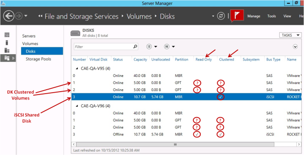 There are some inconsistencies in how cluster disks are shown in the “Disks” display under Server Manager > File and Storage Services > Volumes > Disks.
