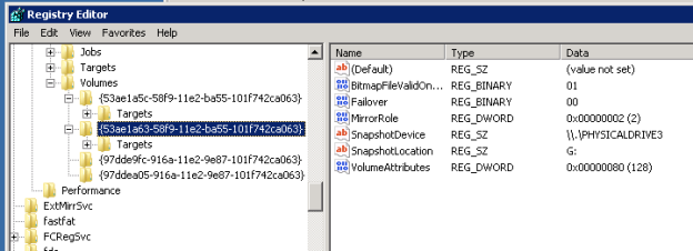 これらの仮想ディスクデバイスを接続すると、ボリュームのキーに SnapshotDevice というレジストリエントリが作成されます。値が \\.\PHYSICALDRIVE に設定され、 は以下に示すディスク番号です。