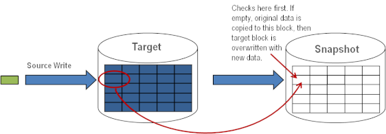 このブロックがすでにスナップショットファイルに書き込まれていると DataKeeper が判断した場合、この手順は省略され、ブロックは単にターゲットに書き込まれます。頻繁に上書きされるソースボリューム上のブロックの場合、スナップショットファイルは 1 回のみ更新する必要があり、スナップショットの実行後の初回にそのブロックが書き込まれます。