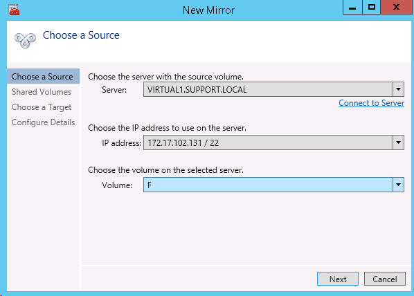 1. Select how (Asynchronously or Synchronously) the source volume data should be sent to the target volume.