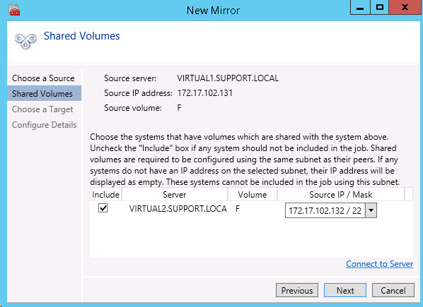 Note: If there are volumes on other systems that are shared with this target volume, the Shared Volumes dialog will appear next. Configure these shared target volumes as you would for shared source volumes, described above.