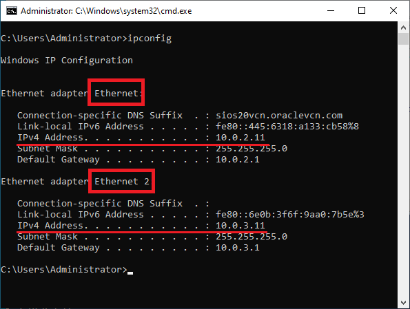 - Run the ipconfig command and check the network adapter names of the primary and secondary NICs from the configured IP addresses. Perform the following steps for both the primary and secondary NICs.