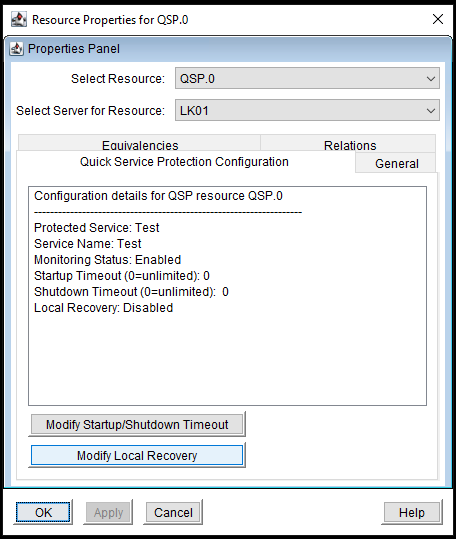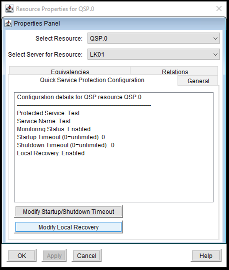 - On the Properties Panel screen, with the “Quick Service Protection Configuration” tab selected, click on “Modify Local Recovery”