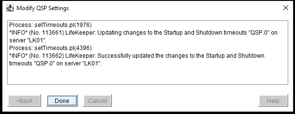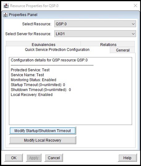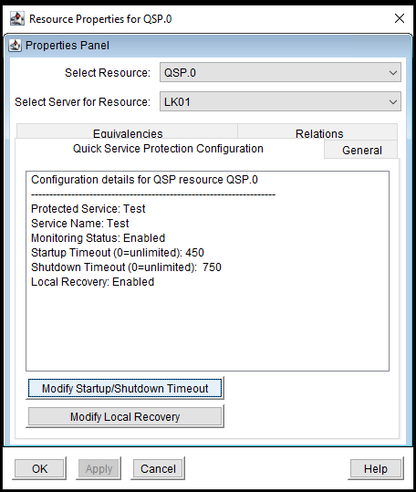 - On the Properties Panel screen, with the “Quick Service Protection Configuration” tab selected, click on “Modify Startup/Shutdown Timeout”.