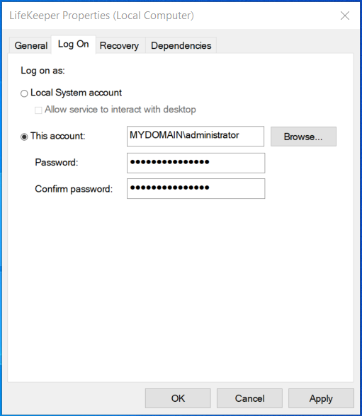 注意: 使用するドメインまたはサーバーアカウントは、ローカルシステム管理者グループに追加する必要があります。アカウントには、LifeKeeperがインストールされている各サーバーの管理者権限が必要です。