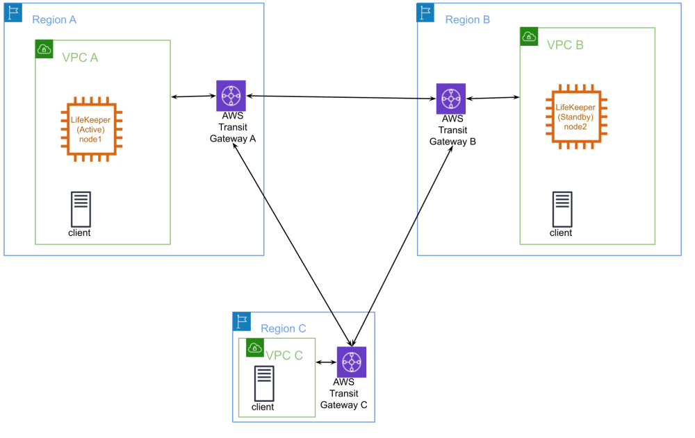 アクティブノードが存在するVPCのルートテーブルには、送信先としてLifeKeeperで保護されている仮想IPアドレス、ターゲットとしてアクティブノードのENIを指定したルートを作成します。これにより、同一VPC上のクライアントから仮想IPアドレスにアクセスすると、このルートの設定に従いアクティブノードへの接続が可能になります。アクティブノードが存在するVPCにアタッチされたTransit Gatewayのルートテーブルには、送信先としてLifeKeeperで保護されている仮想IPアドレス、ターゲットとしてアクティブノードが存在するVPCを指定したルートを作成します。それ以外のTransit Gatewayのルートテーブルには、送信先としてLifeKeeperで保護されている仮想IPアドレス、ターゲットとしてアクティブノードが存在するVPCにアタッチされたTransit Gatewayを指定したルートを作成します。アクティブノードが存在するVPC以外のVPCのルートテーブルには、送信先としてLifeKeeperで保護されている仮想IPアドレス、ターゲットとしてアタッチされたTransit Gatewayを指定したルートを作成します。これらのルートテーブルの操作により、各VPC上のクライアントからの仮想IPアドレスへのアクセスは、アクティブノードに送信されます。