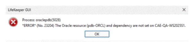 Oracle PDB リソースの削除中、プロパティパネルが開いている場合に LifeKeeper のエラーダイアログ 23204が表示されることがあります。これは LifeKeeper プロパティーパネルの更新サイクルと削除の操作の競合によるものです。 Oracle PDBリソースが依存関係を外してから削除されるまでの間にプロパティパネルが更新されると、エラーダイアログが表示されます。