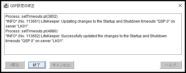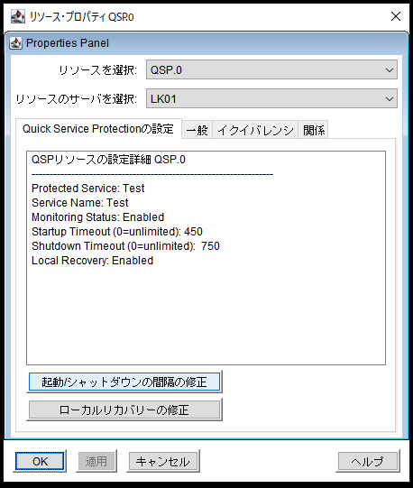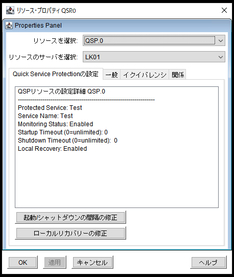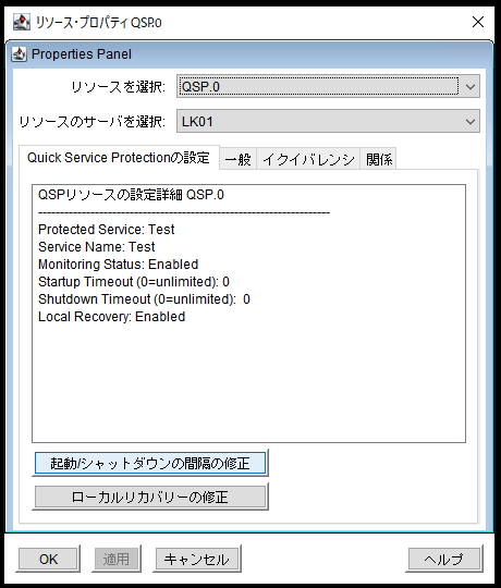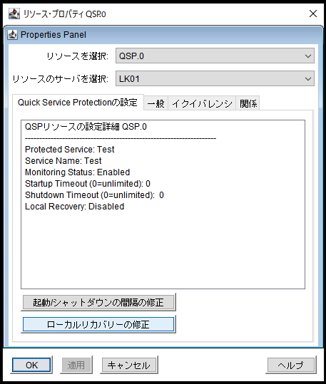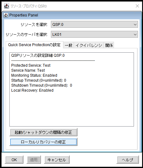 QSP リソースのプロパティの変更は両方のサーバーで実行する必要があります。QSPリソースの変更には、監視状態、クイックチェック間隔、スタートアップタイムアウト、シャットダウンタイムアウト、ローカルリカバリーの変更が含まれます。保護対象のサービスを変更することはできません。