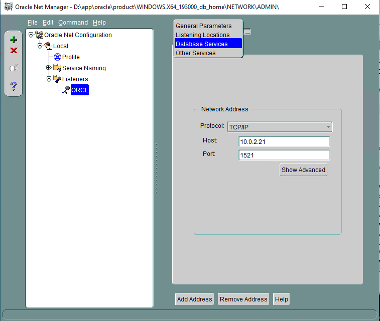 - Select Listeners > ORCL in the left pane and select Address1 in the right pane.