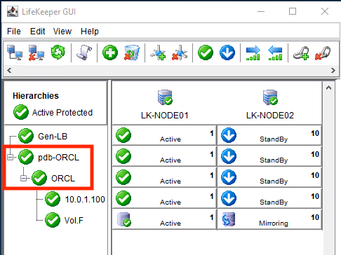 1. Oracle プラガブル・データベースのリソース階層が作成されると、次の画面が表示されます。なお、Oracle リソースは親リソースである「pdb-ORCL」の子リソースです。