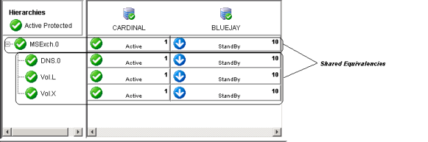 In the example below, a shared equivalency exists between each hierarchy level on a pair of servers. For example, the MSExch.0 resource exists on both servers, and there is a shared equivalency between the two instances of MSExch.0 (just as there is between the one DNS instance and the two volume instances).