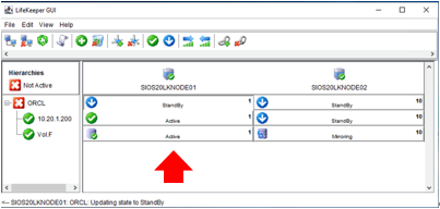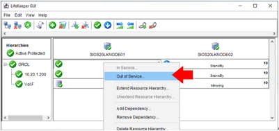 - 稼働系(SIOS20LKNODE01)のORCLリソースを右クリックし、 Out of Service を選択します。
