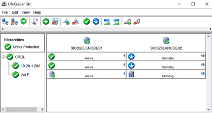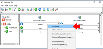 - 稼働系(SIOS20LKNODE01)のORCLリソースを右クリックし、 In Service を選択します。
