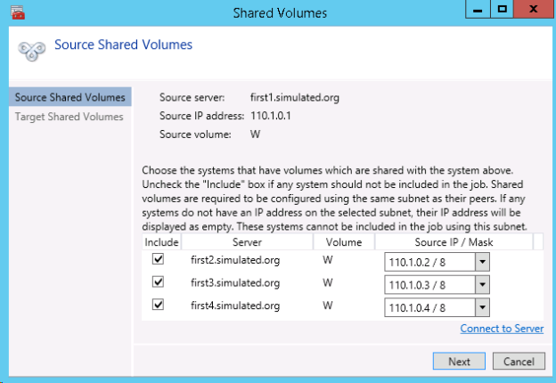 If a volume is mirrored to more than one target and you want to add or remove a shared system on the source side of the mirror, you can choose any of the mirrors, since they all refer to the same source volume. Choose the Manage Shared Volumes action for that mirror, and the Shared Volumes dialog will appear.