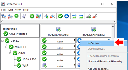 1. 待機系(SIOS20LKNODE02)のORCLリソースを右クリックし、 In Service を選択します。ORCLリソースは待機系にスイッチオーバーします。