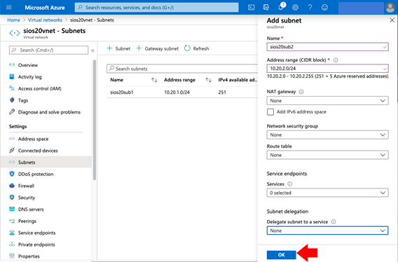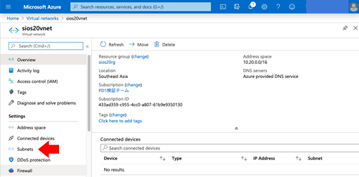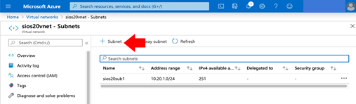- Click Azure Home > Virtual networks > sios20vnet, then click Settings > Subnets in the left pane.