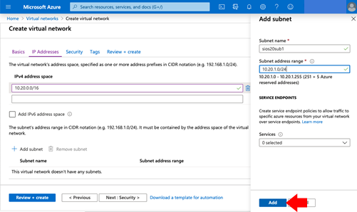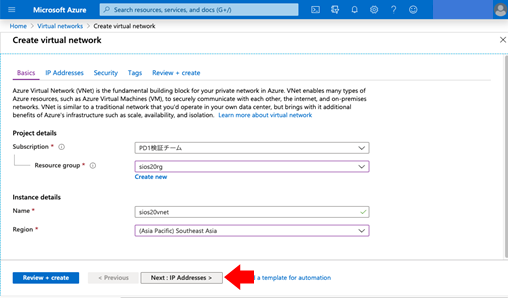 - Select Azure Home > Virtual networks > Add and enter the required value according to the following table.